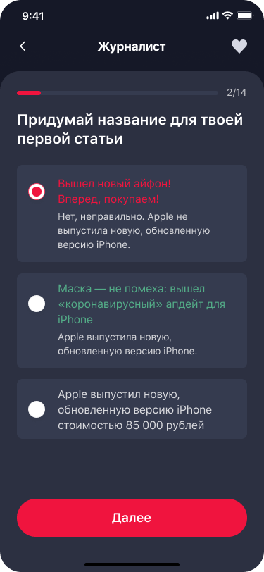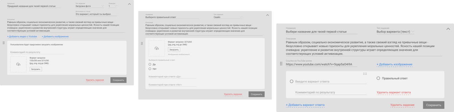 Например: выбор одного из нескольких вариантов, ввод собственного текста, загрузка эскиза или способ, который мы предложили, учитывая продвинутую молодую ЦА — свайпер)