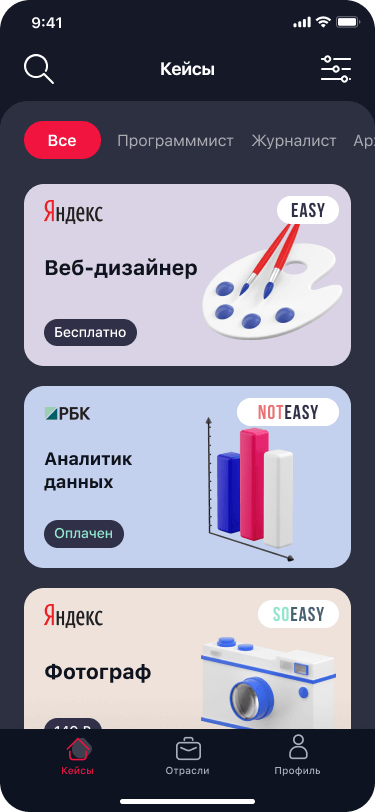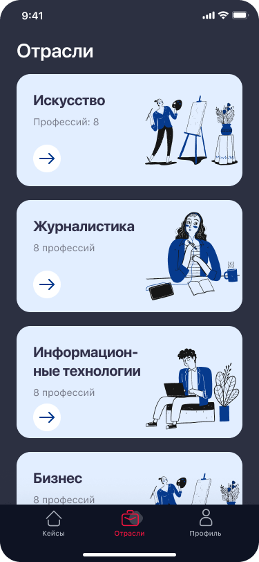 Если не знаешь, какая профессия тебе подходит — посмотри список отраслей, почитай про них, изучи список профессий, а потом смело переходи к кейсам.
