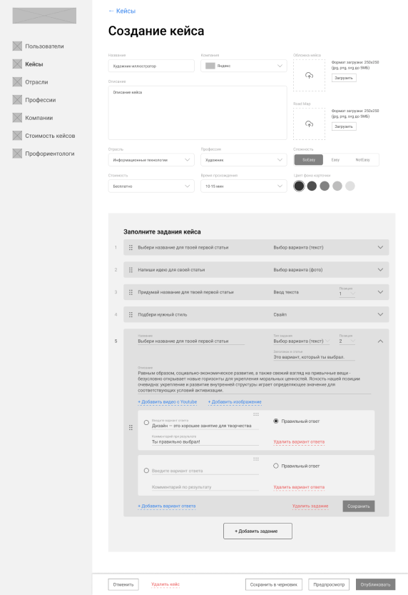 Сам кейс содержит разные типы заданий, форматы которых мы отобрали проведя анализ рынка.