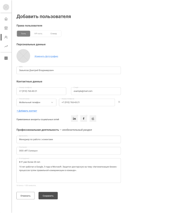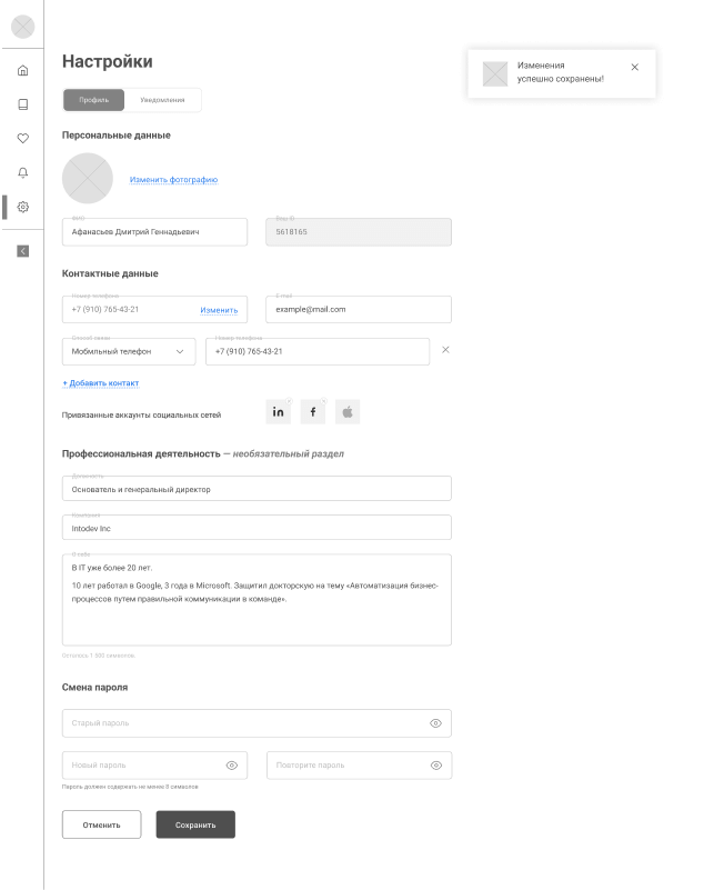 Пользователь может заполнить данные о себе в настройках профиля. Эти данные будут отображаться в его карточке и визитках.