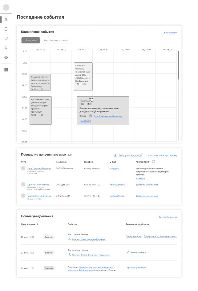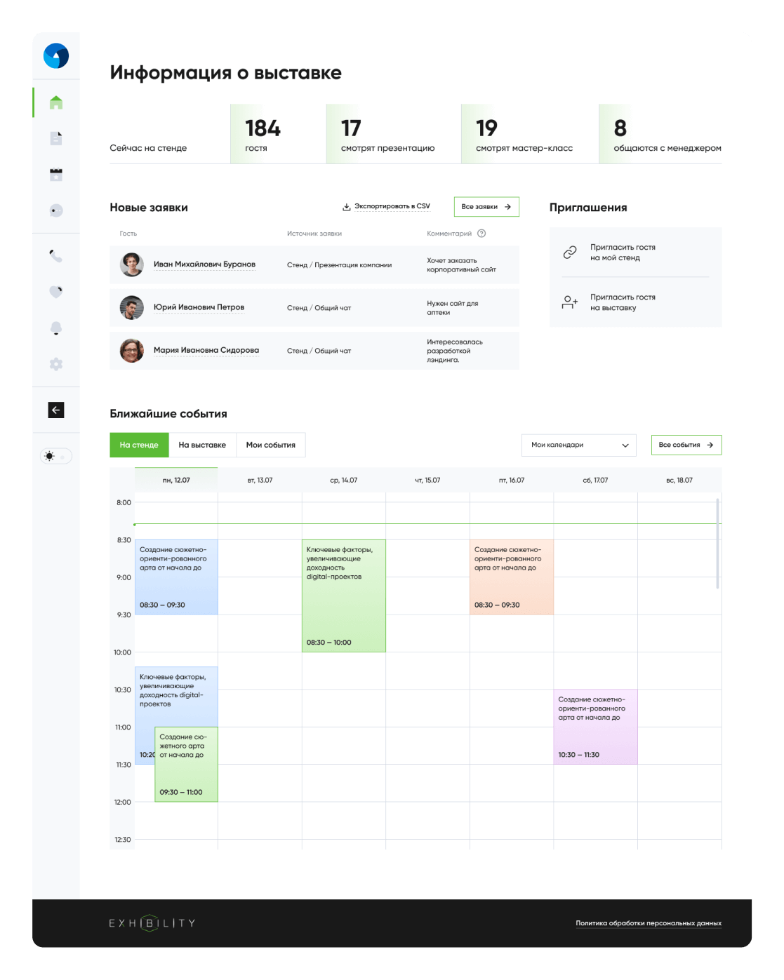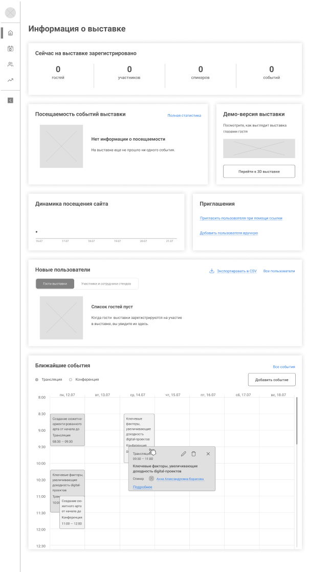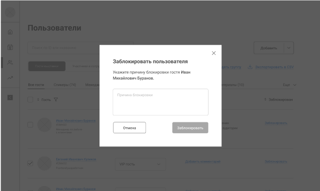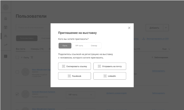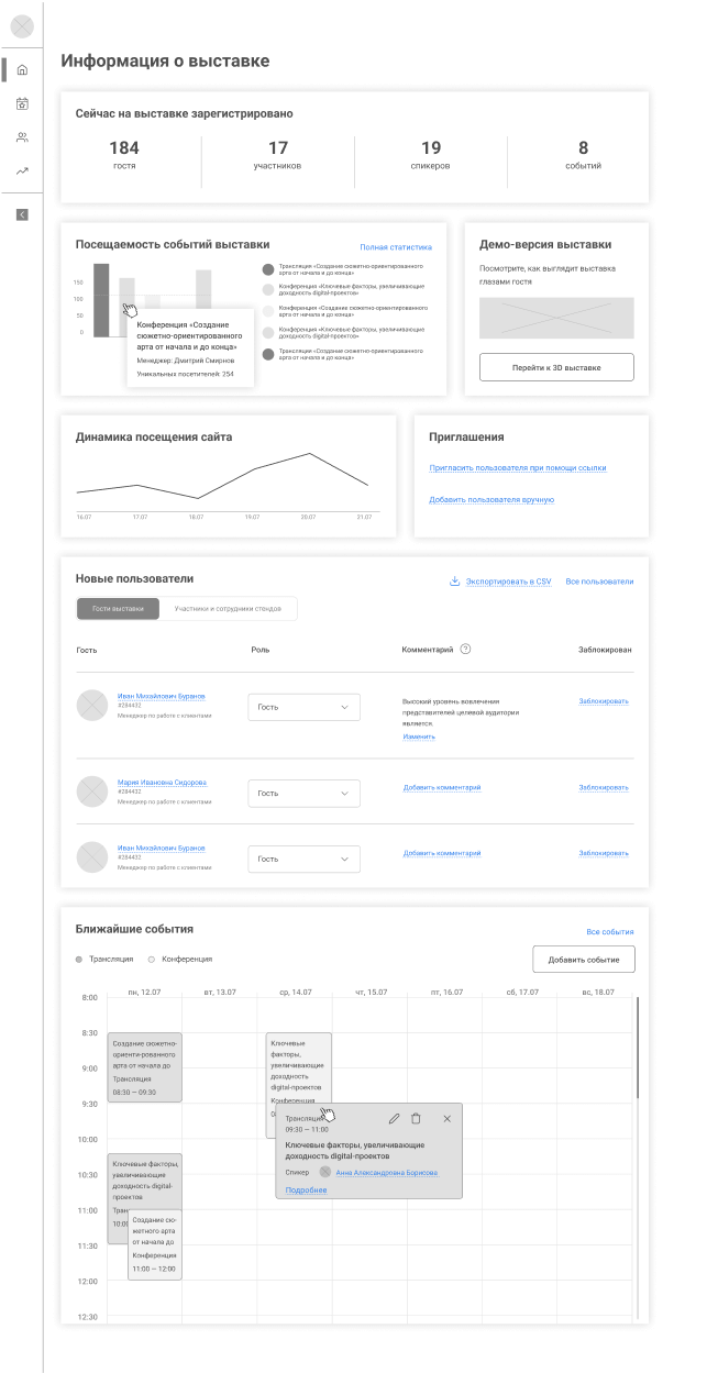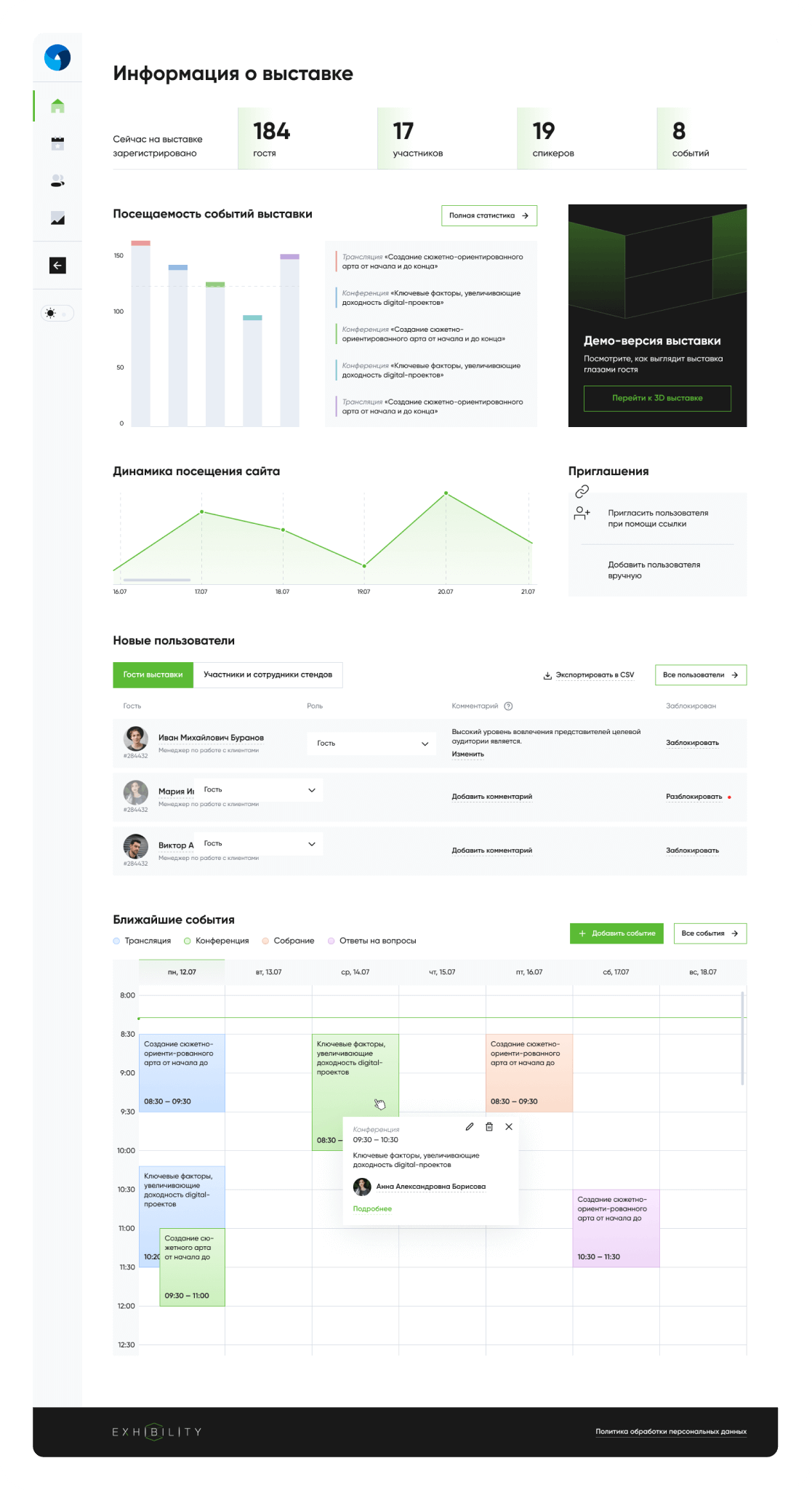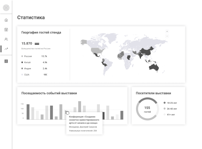 Статистику по выставке разместили в первых блоках личного кабинета, чтобы пользователь мог быстро отслеживать изменения. Помимо этого, спроектировали удобный список гостей и участников, который помогает администрировать выставку.