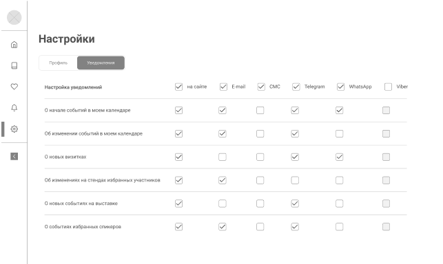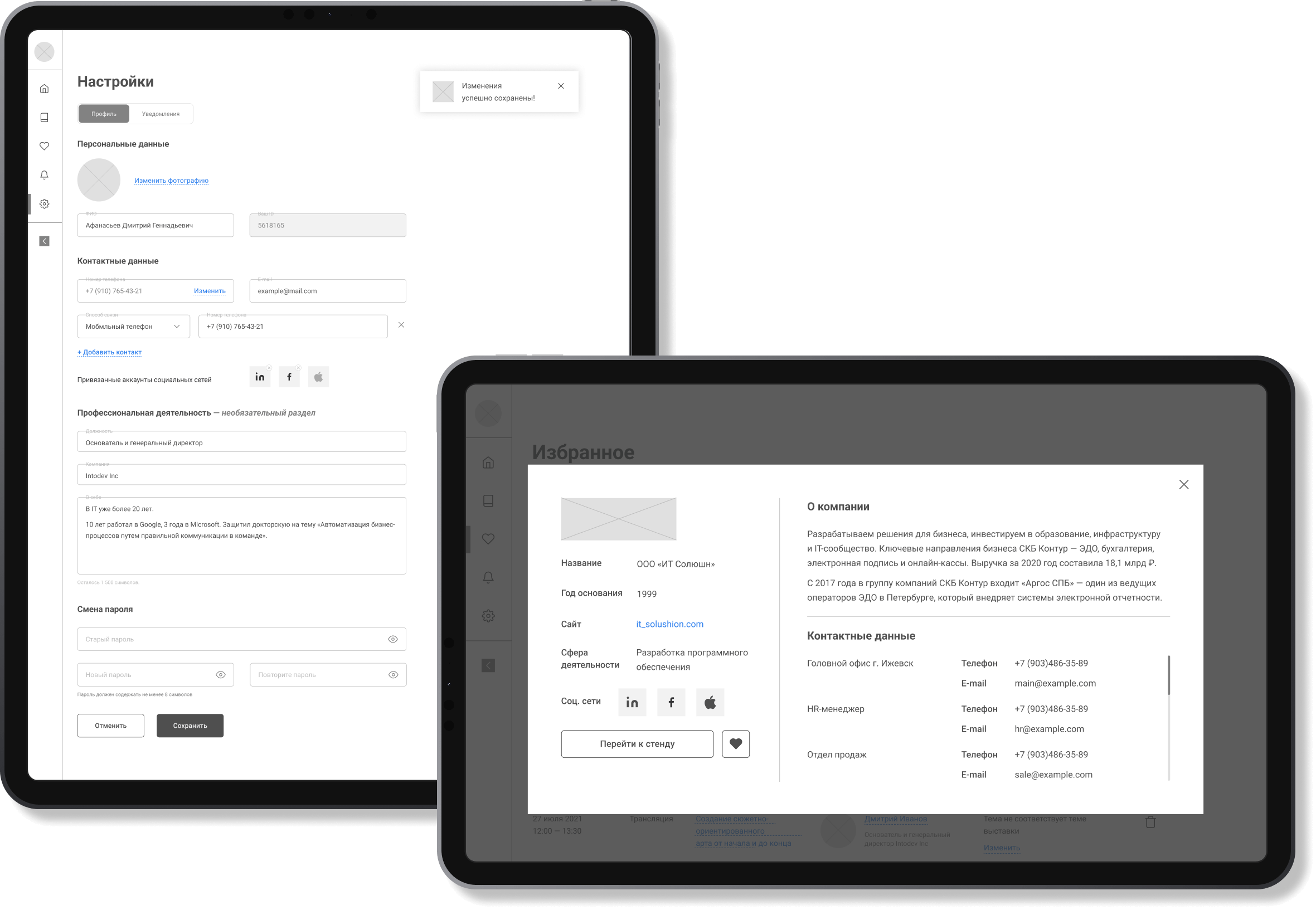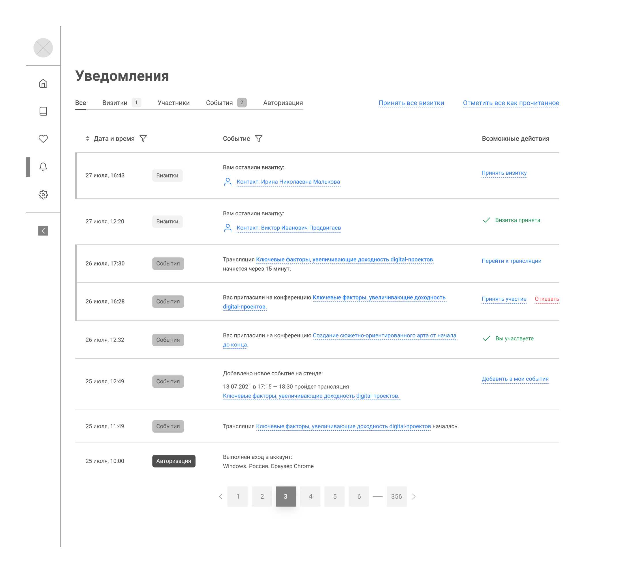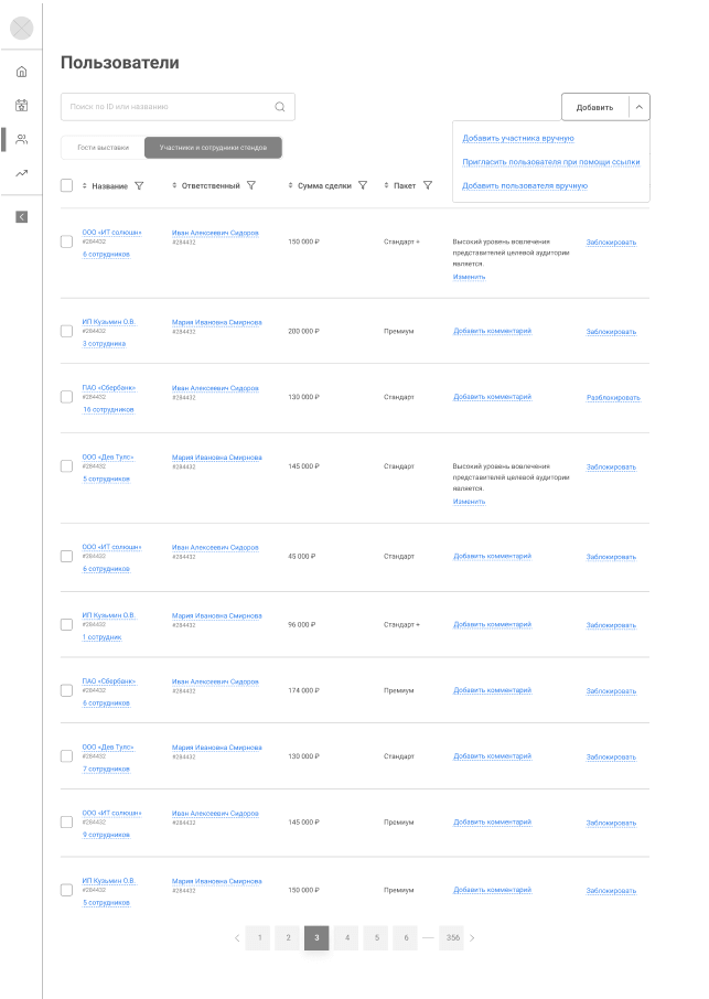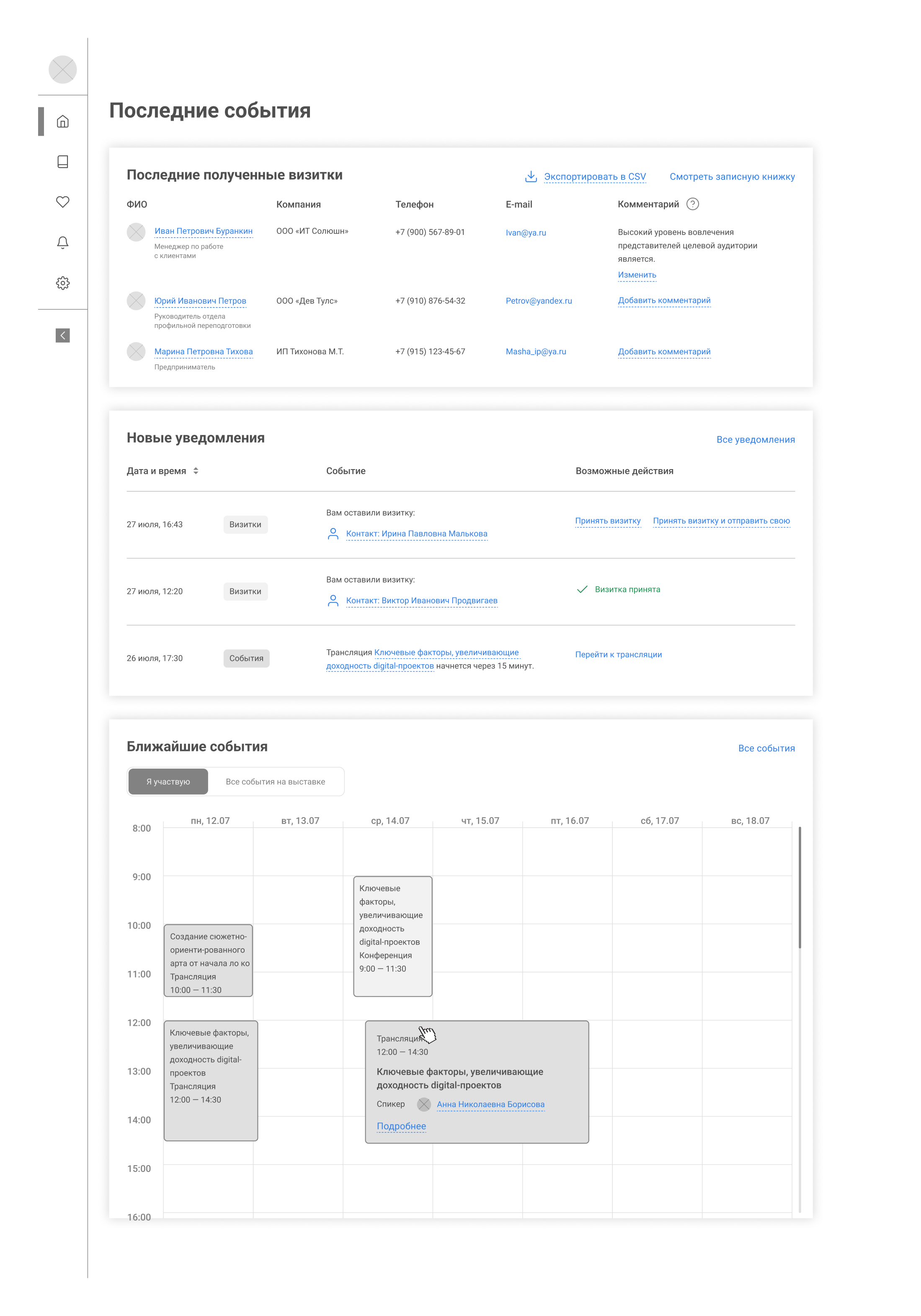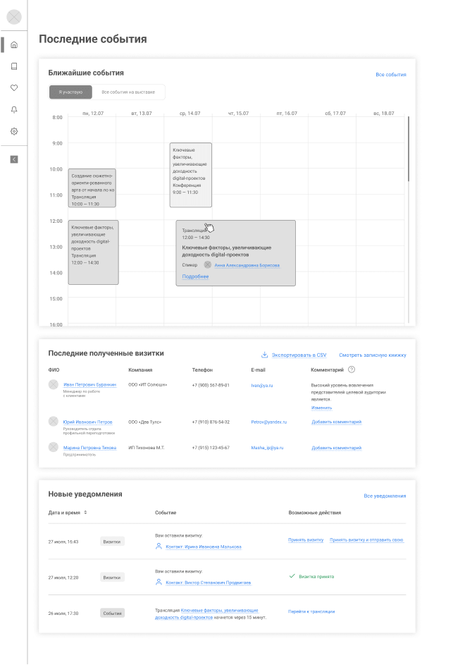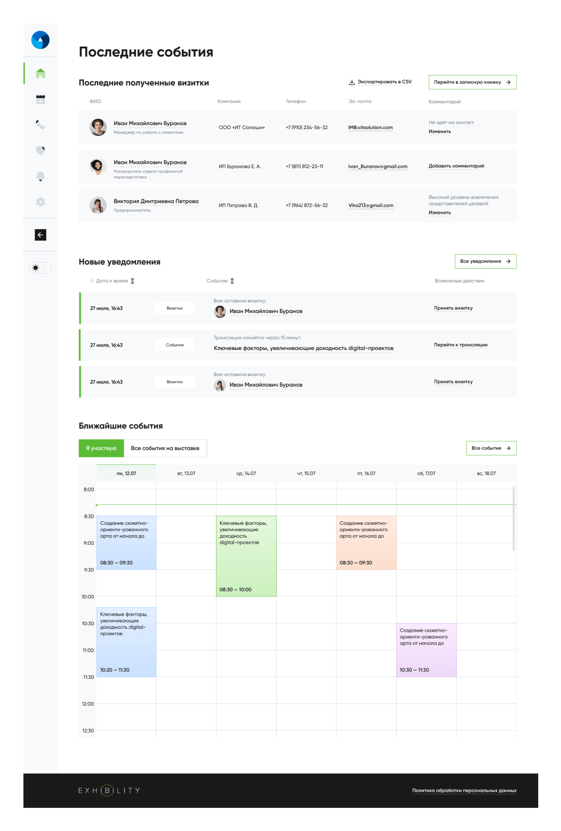 Статистику по выставке разместили в первых блоках личного кабинета, чтобы пользователь мог быстро отслеживать изменения. Помимо этого, спроектировали удобный список гостей и участников, который помогает администрировать выставку.