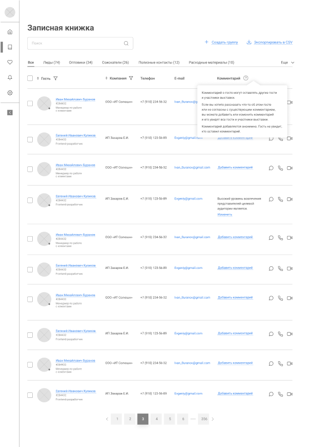 Карточка гостя содержит всю необходимую для связи информацию, это упрощает работу менеджерам выставок.