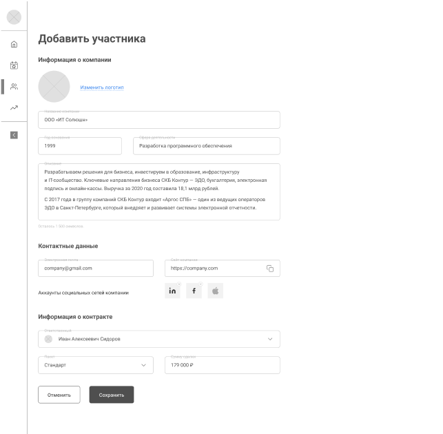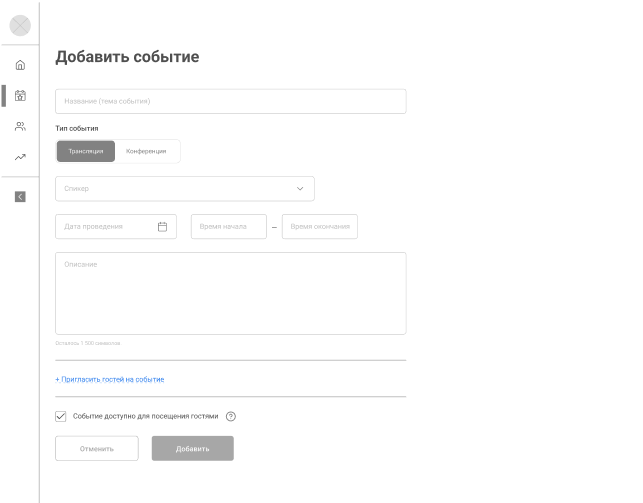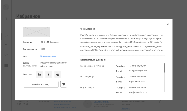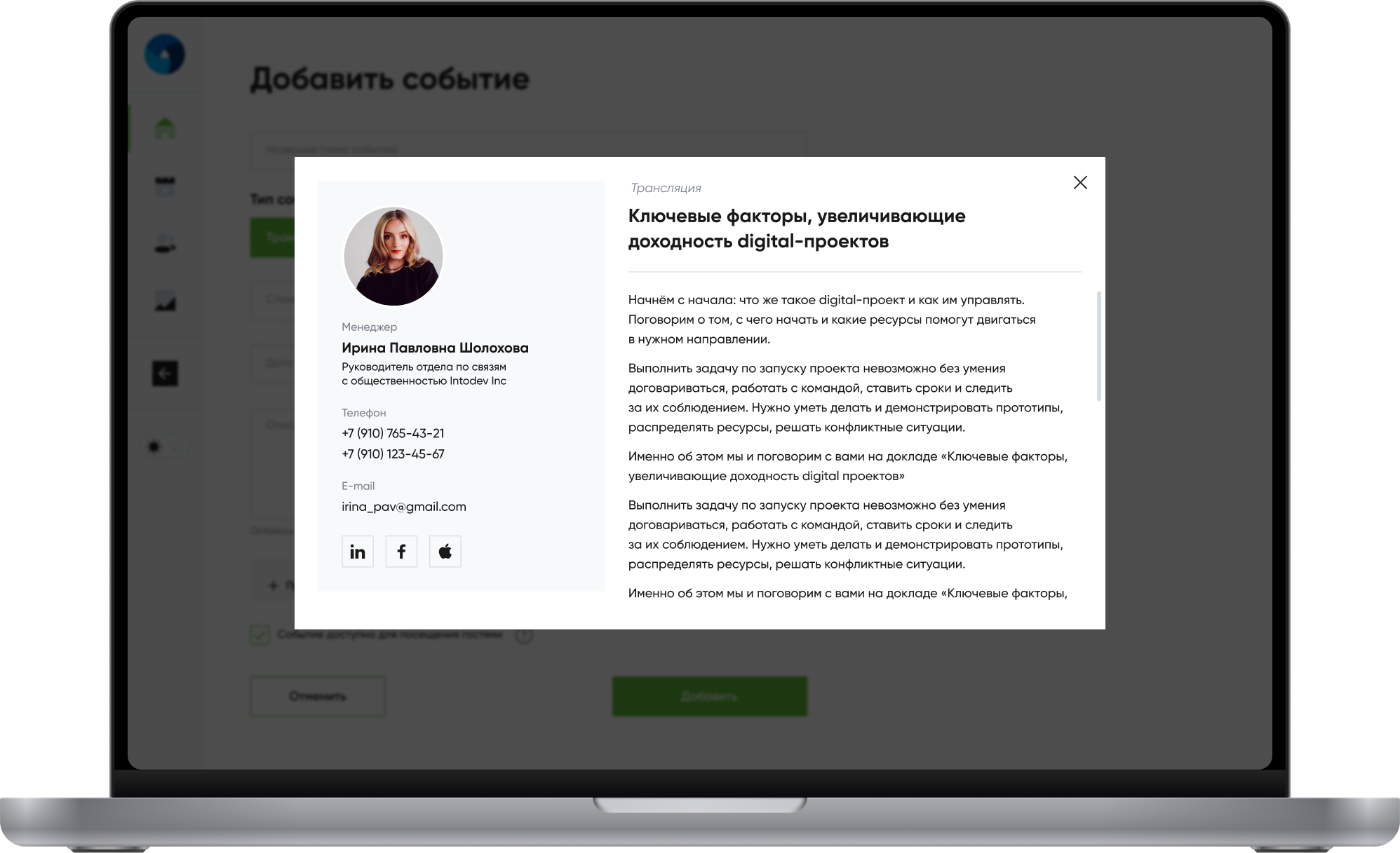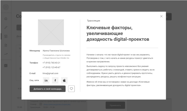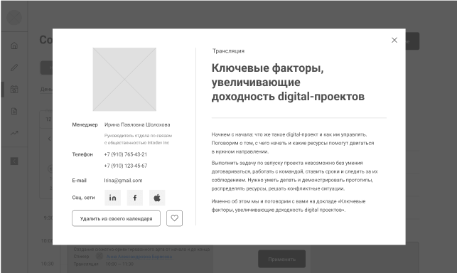 Рассмотрим вариант с мероприятием: в данном случае было важно разместить все необходимое в небольшом окне. При этом, сделать так, чтобы пользователь мог удобно ориентироваться, видеть весь необходимый ему функционал.