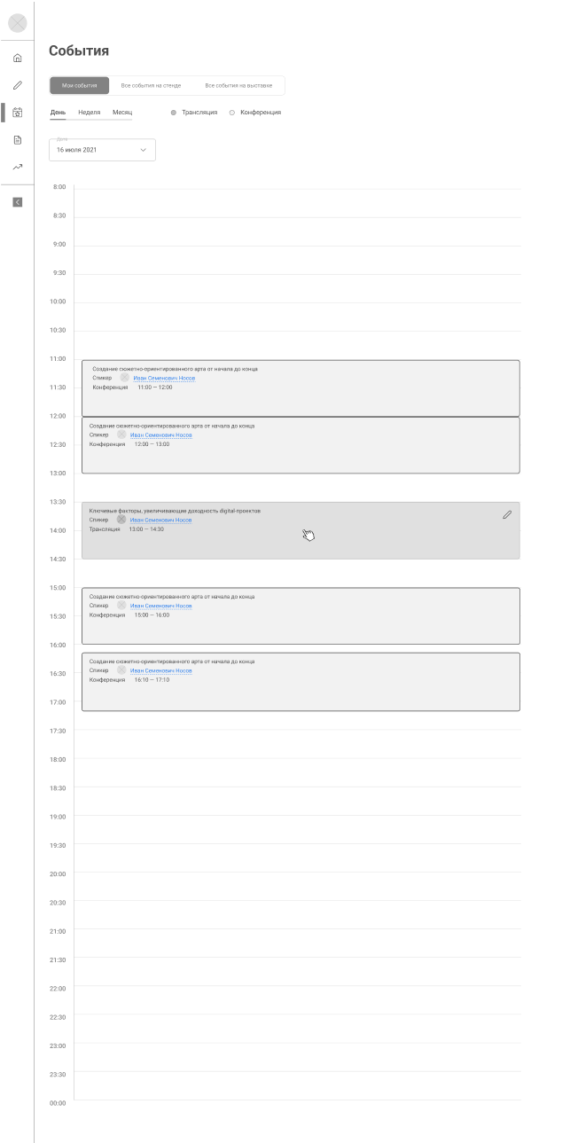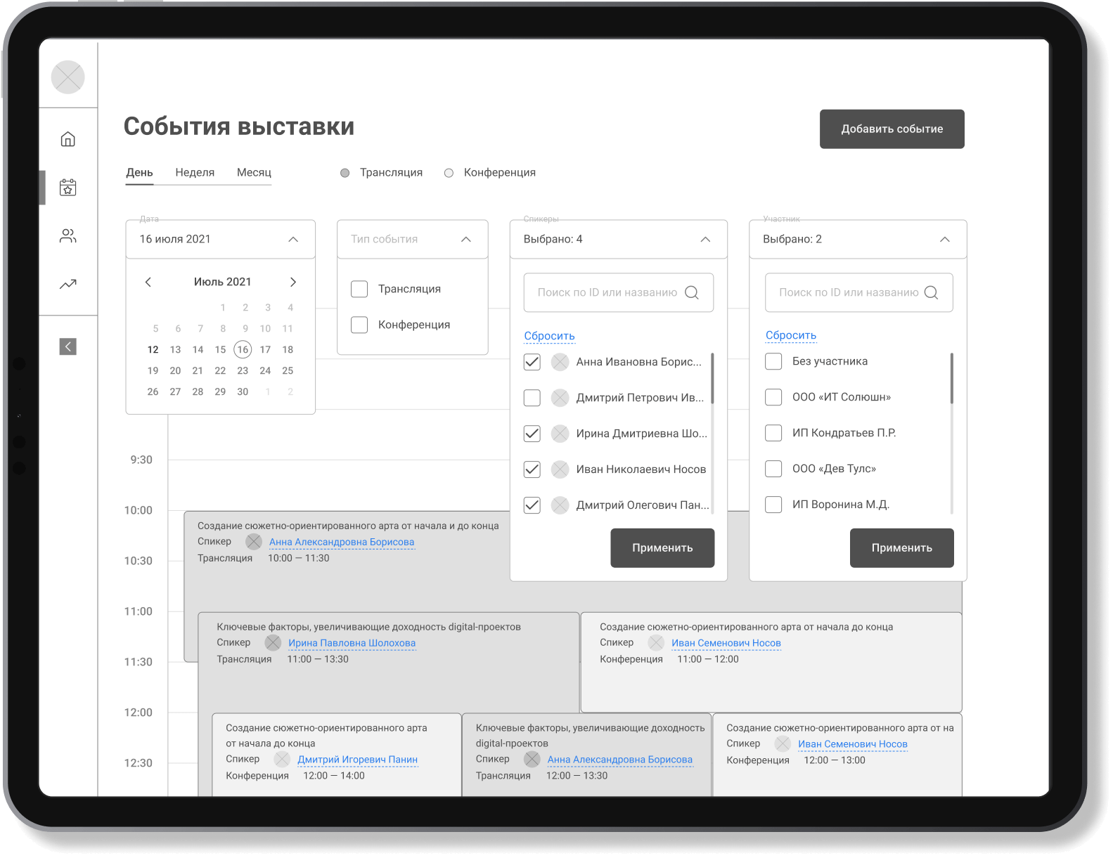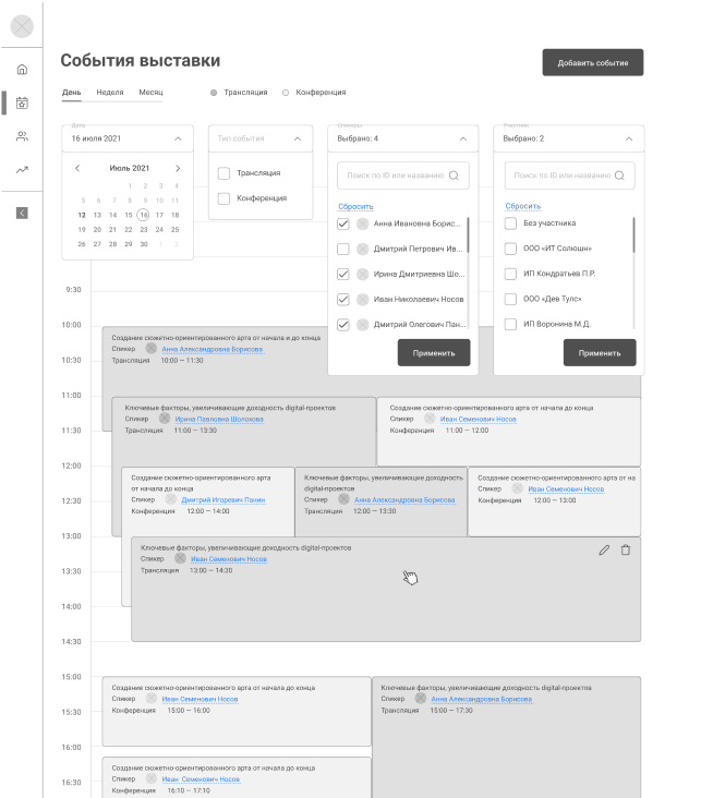 Благодаря фильтрам, можно легко найти нужное событие. События фильтруются по дате, типу, спикерам и участникам.