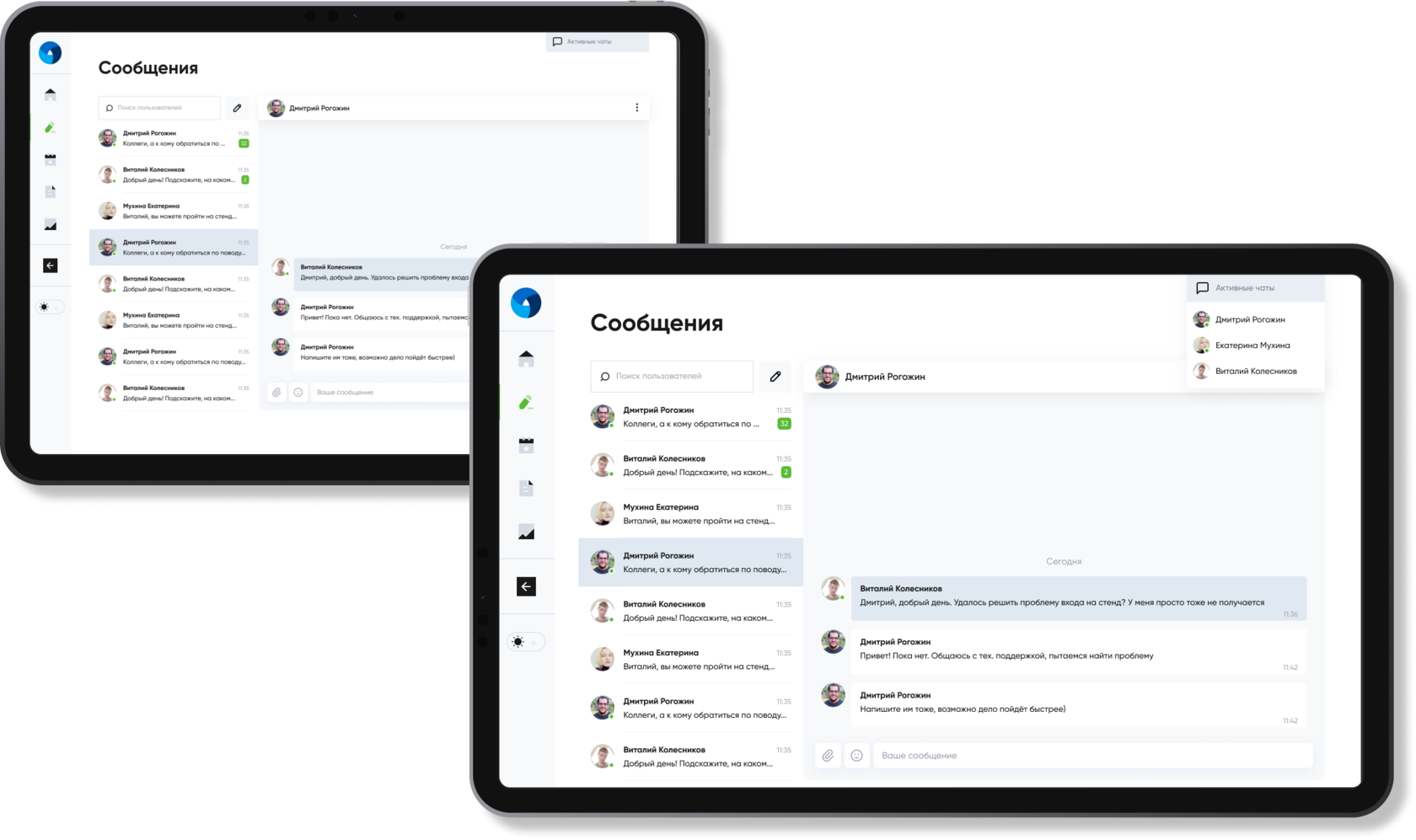 В чате пользователи с администрирующими ролями подсвечиваются, их роль на мероприятии подписана. Так гости мероприятия смогут быстро визуально сортировать сообщения. Помимо этого, в списке есть табы, где пользователи отсортированы на 3 группы. Получая сообщение от пользователя, находящегося в одной из групп, в табе появляется плашка с уведомлением. Такой подход ускоряет работу с чатом.