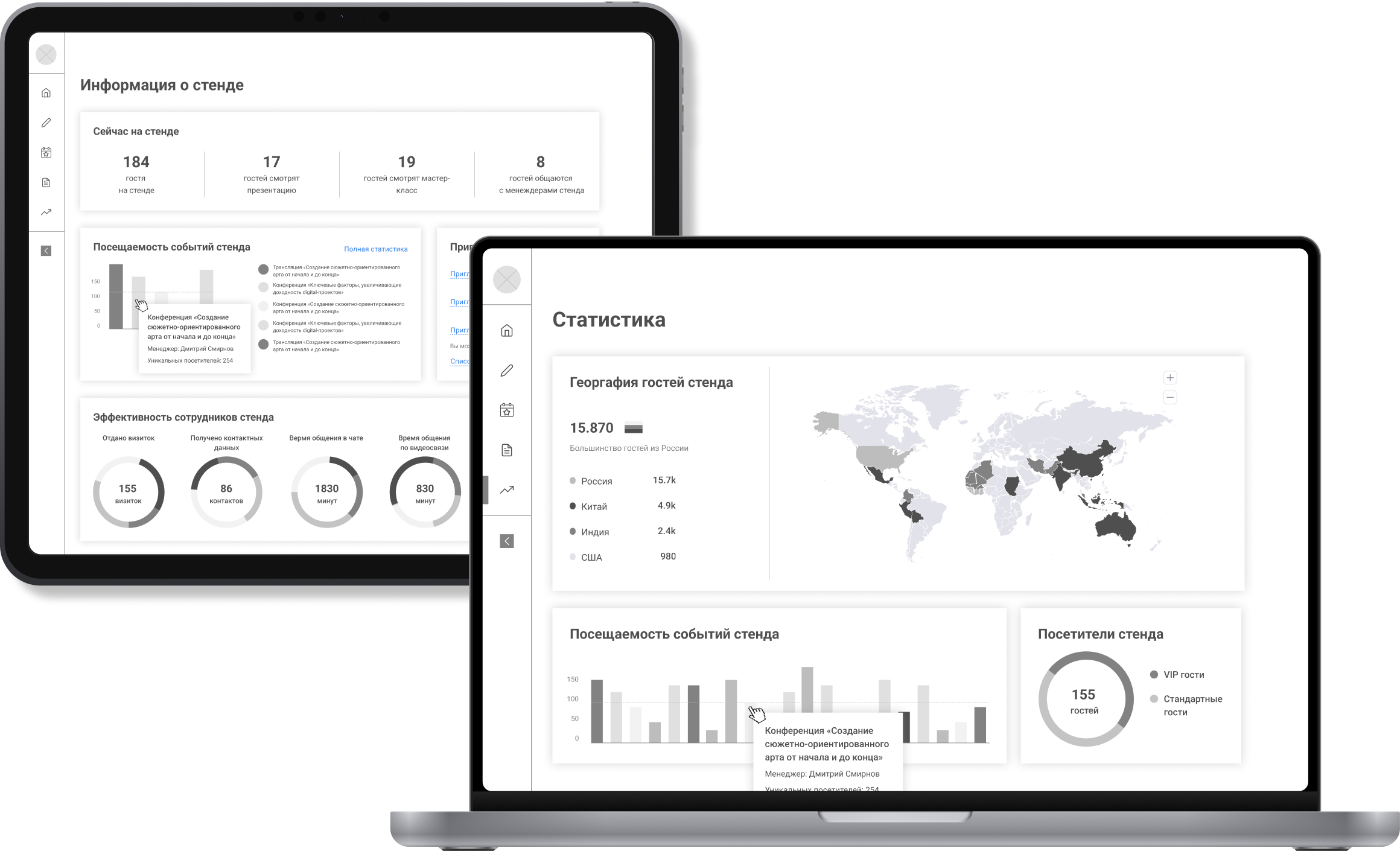 В дашборде располагается полезная информация о стенде. Благодаря блоку «Эффективность сотрудников стенда», компания может отслеживать и повышать свои показатели. При этом, статистика стенда помогает компаниям узнавать больше информации о своих гостях.