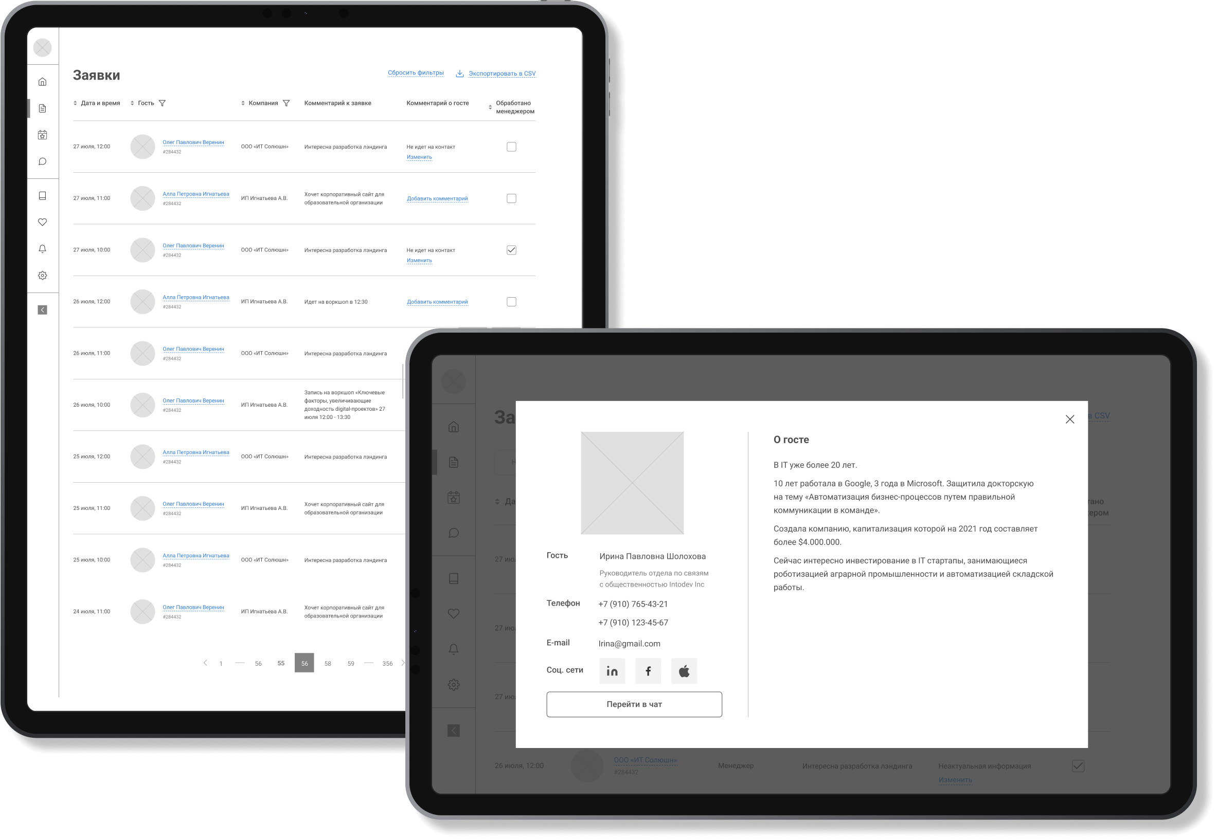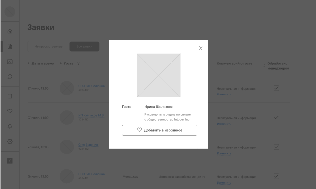 Страница заявок разработана так, чтобы менеджеры могли быстро получать и обрабатывать запросы. Заявки сортируются по дате получения, гостю, компании и статусу.