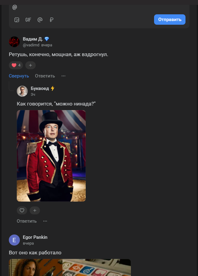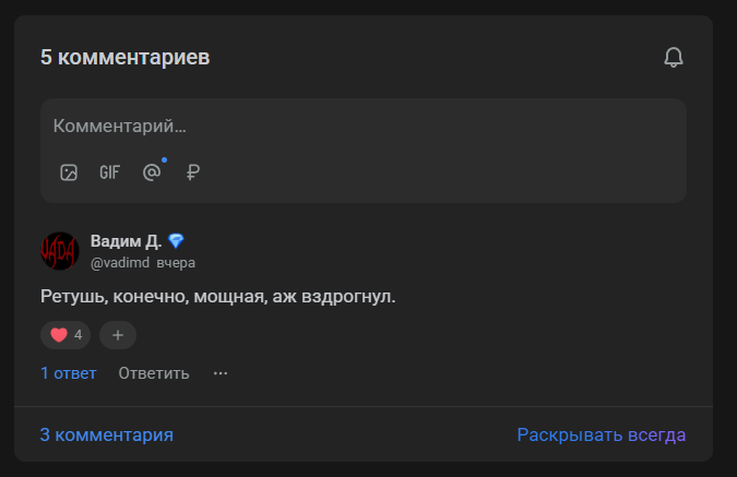 С точки зрения бизнеса возможно это и хороший ход. Ведь это «один из плюсов» подписки. Но чисто как пользователь я этого как не понимал 3 года назад, так и не понимаю сейчас. Тем не менее сами комментарии делятся на «ветки», что весьма удобно (привет, VK Видео). По самому взаимодействию — вы можете поставить реакт, ответить текстово, отправить фото/гифку, задонатить или упомянуть другой аккаунт.