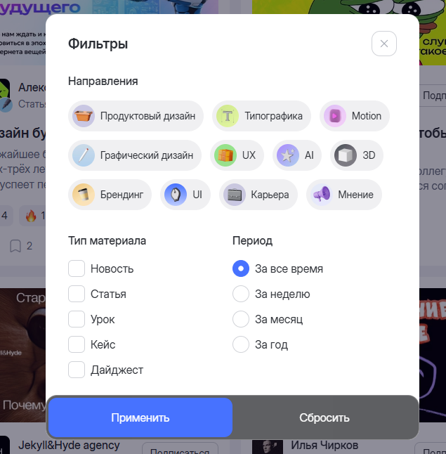 Также радует возможность кастомизации самой ленты. Если интересно увидеть материалы и по «Типографике» и по «3D», не нужно переключаться между двумя темами, как это было бы на VC. Выбираешь темы в отдельной выпадашке, ставишь тип материала, период и смотришь все на главной.