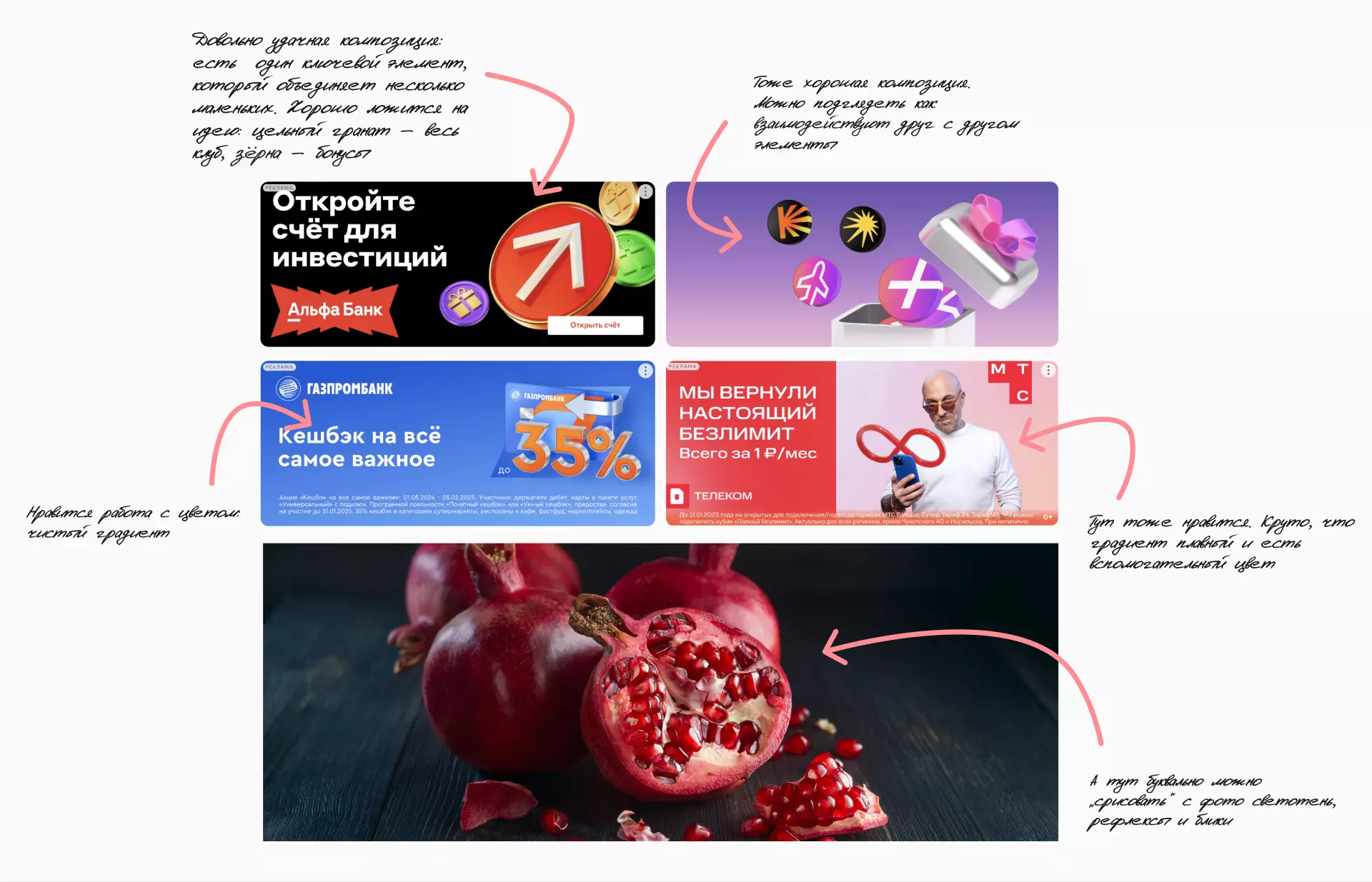 Первый этап работы над креативом — это поиск идеи. Отправной точкой был образ граната: снаружи он выглядит просто, но внутри него десятки ярких зёрен.