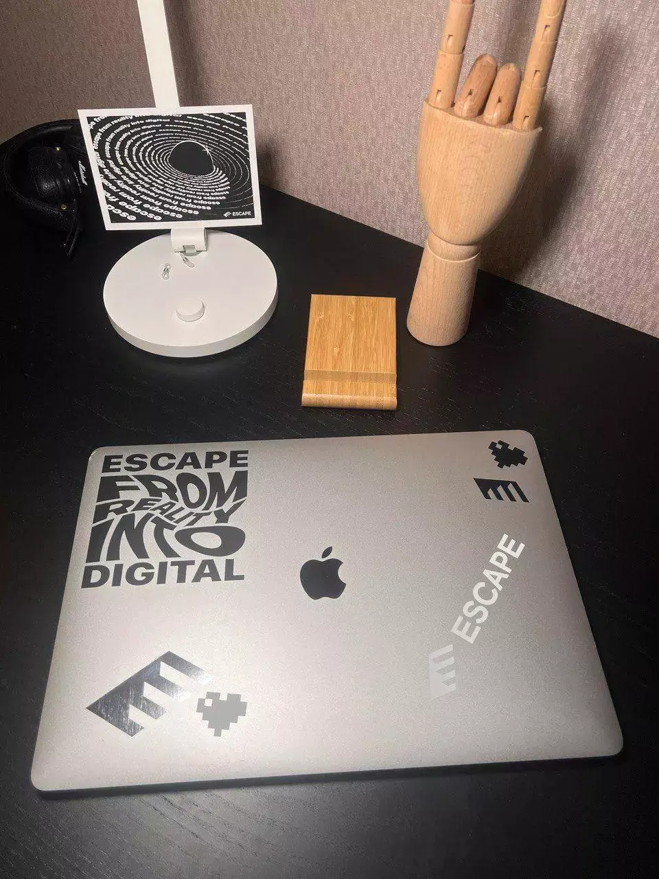 Другой набор мерча - толстовки и футболки у нас со слогоном Escape from reality into digital. Особенно круто получилась партия где мы закрутили эту надпись в космосе.